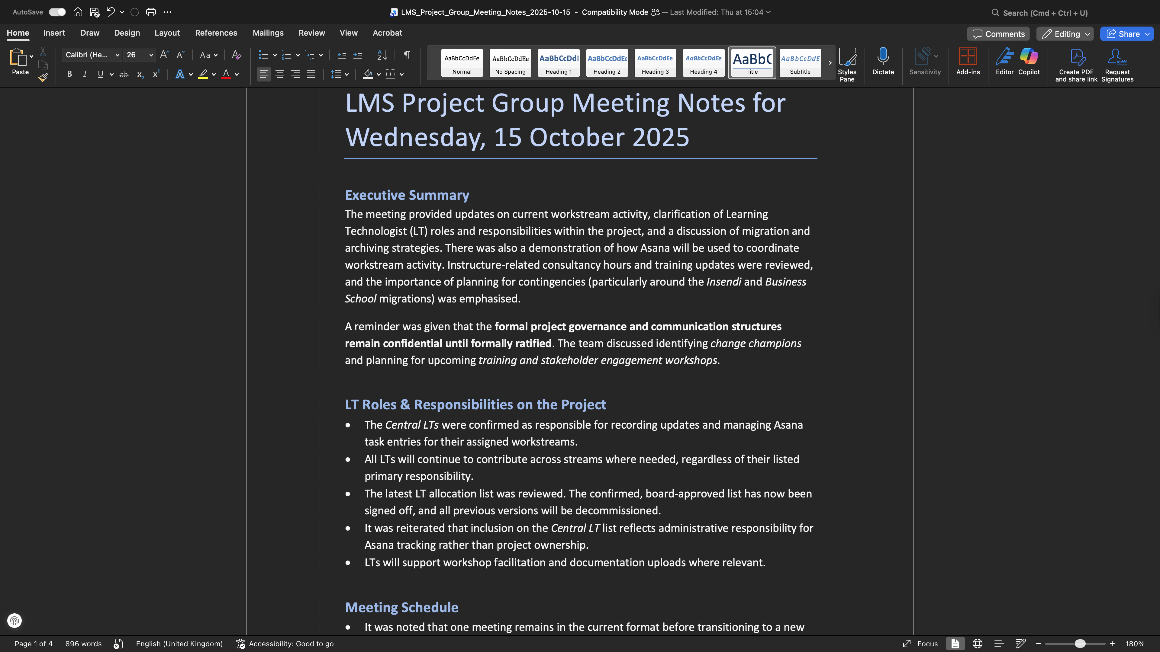 - LMS Project Group Meeting Notes (October 2025) (Screenshot) Example of structured, agenda-linked notes produced during DEPP meetings. Demonstrates learning from colleagues' communication practices and the application of accessible formatting principles. Shared with the consent of project leads; anonymisation not required.