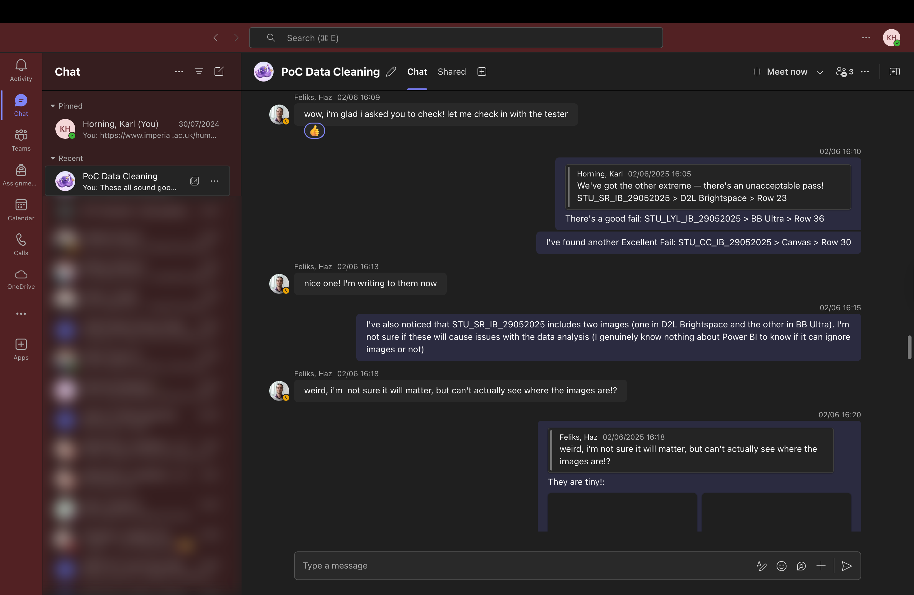 - PoC Data Cleaning Collaboration Screenshot (June 2025) (Image) Screenshot from Microsoft Teams showing collaborative communication with a Business School colleague during the Proof of Concept data-cleaning phase. Demonstrates how discrepancies were discussed, clarified, and actioned in real time. Shared with the colleague's consent; anonymisation not required.